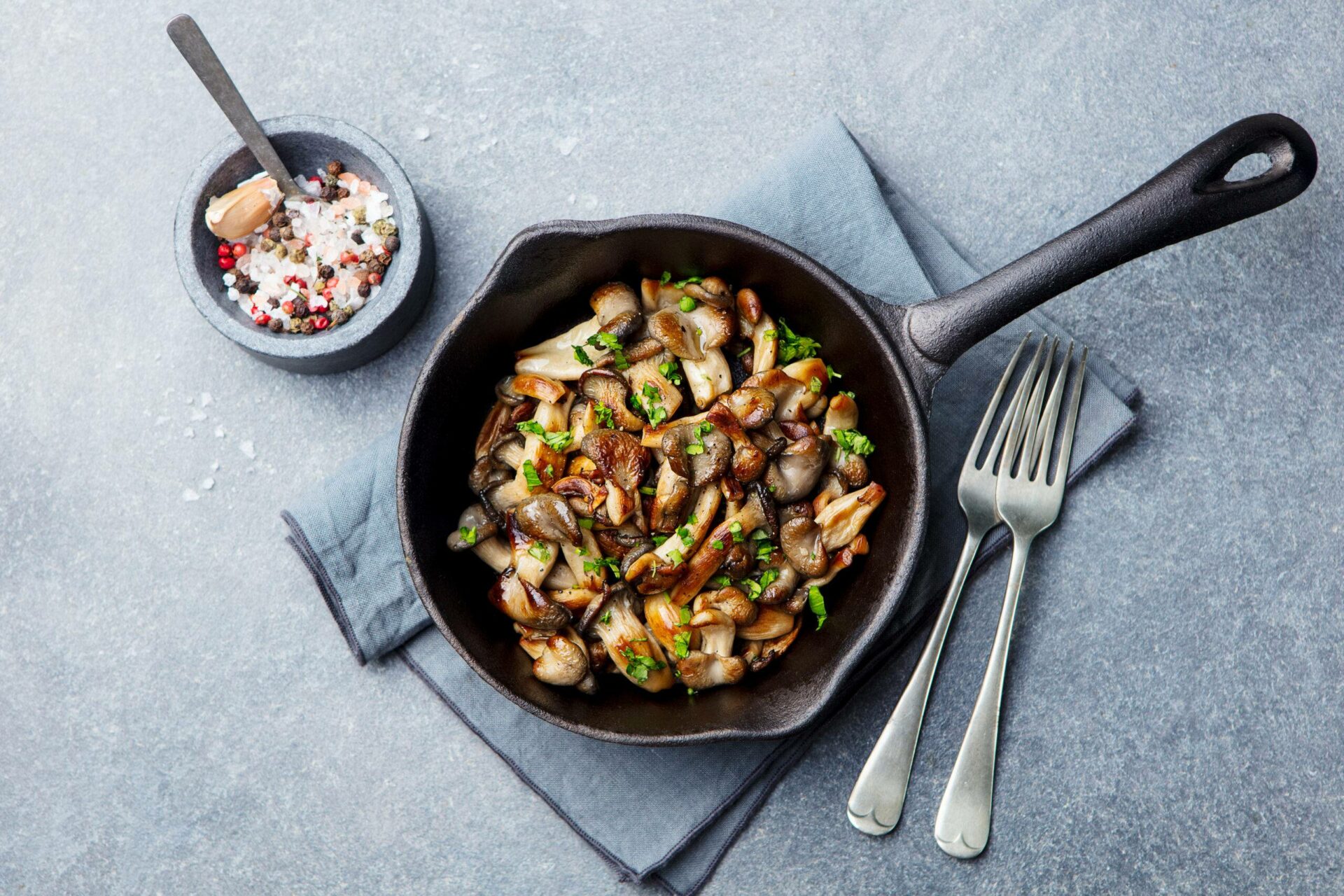 Zutaten: Schneide die Stiele der Austernpilze ab (du kannst sie auch in der Mitte teilen), lasse die Kappen ganz. Erhitze das Olivenöl